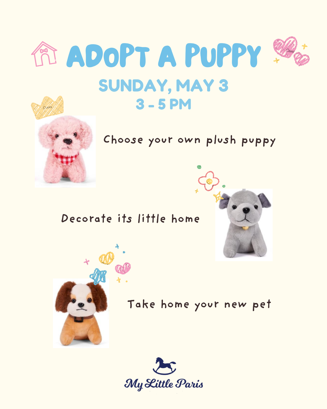 Our Adopt-A-Puppy Workshop is happening again this Sunday 5/2 — perfect for those who missed it last time (or want to adopt another furry friend 😉)!